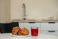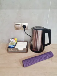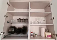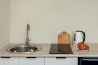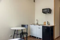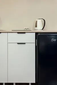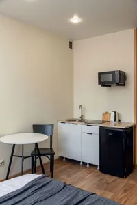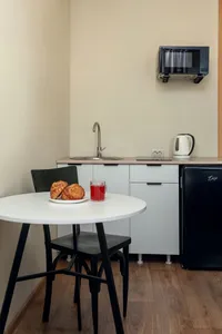 • кухонная зона полностью оборудована: холодильник, плита, микроволновая печь, чайник.
