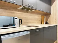 ✅ Оборудованная кухонная зона (Электрическая плитка, холодильник, микроволновая печь, электрический чайник, кухонный гарнитур, вся необходимая посуда для приготовления)