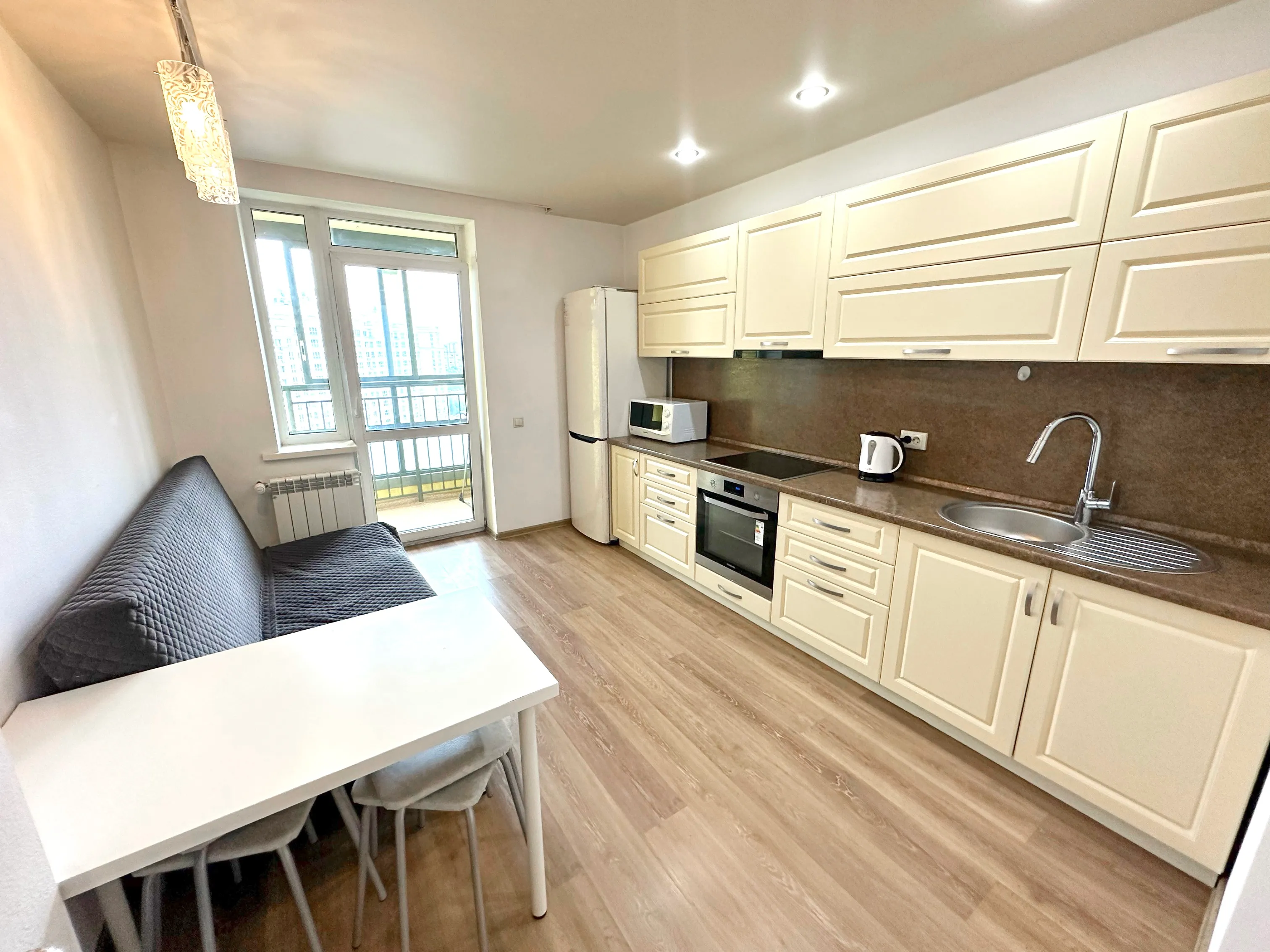 В наличии просторная кухня, где есть: кухонный гарнитур, мягкая мебель, телевизор, варочная поверхность, чайник, посуда.