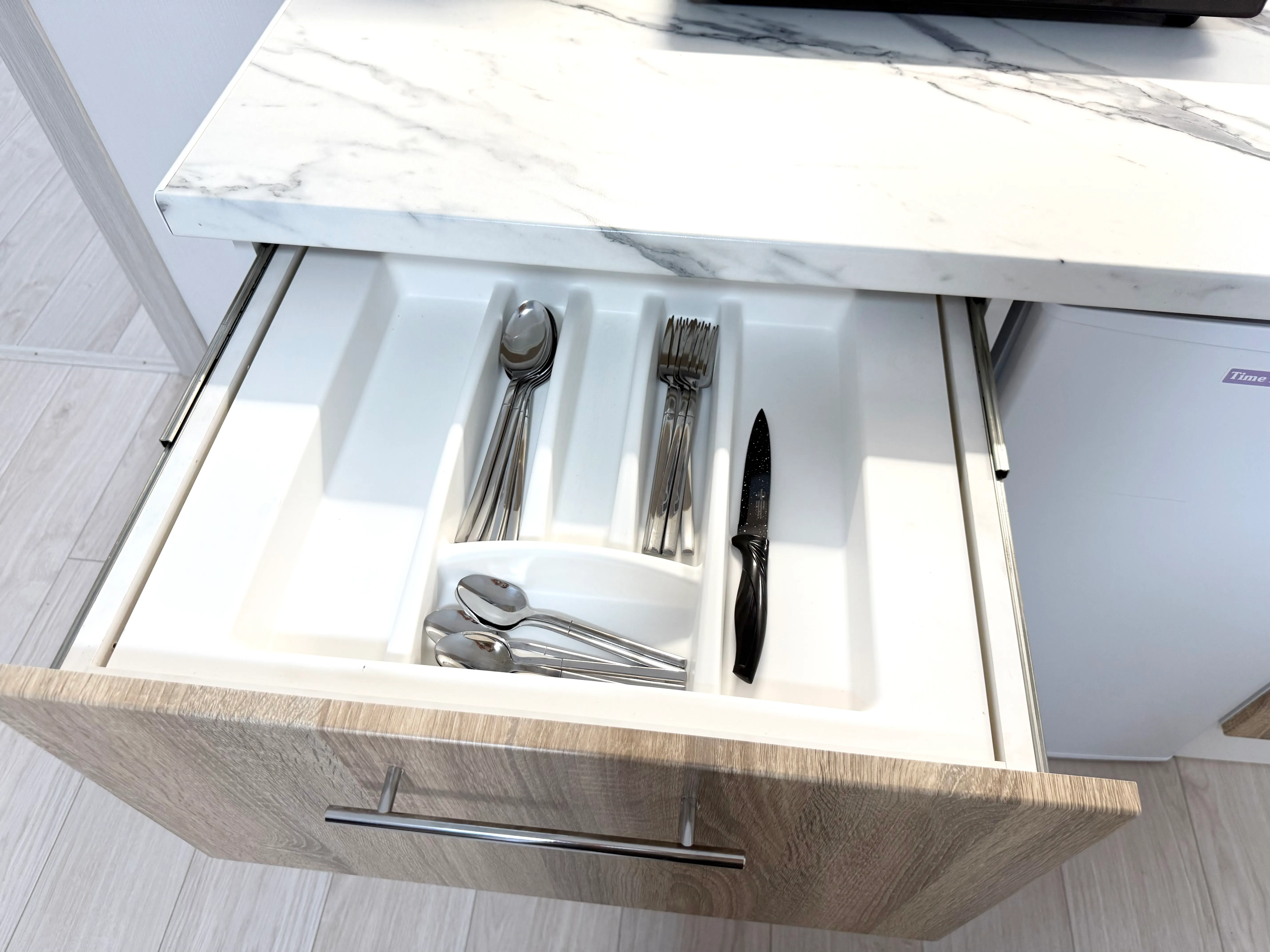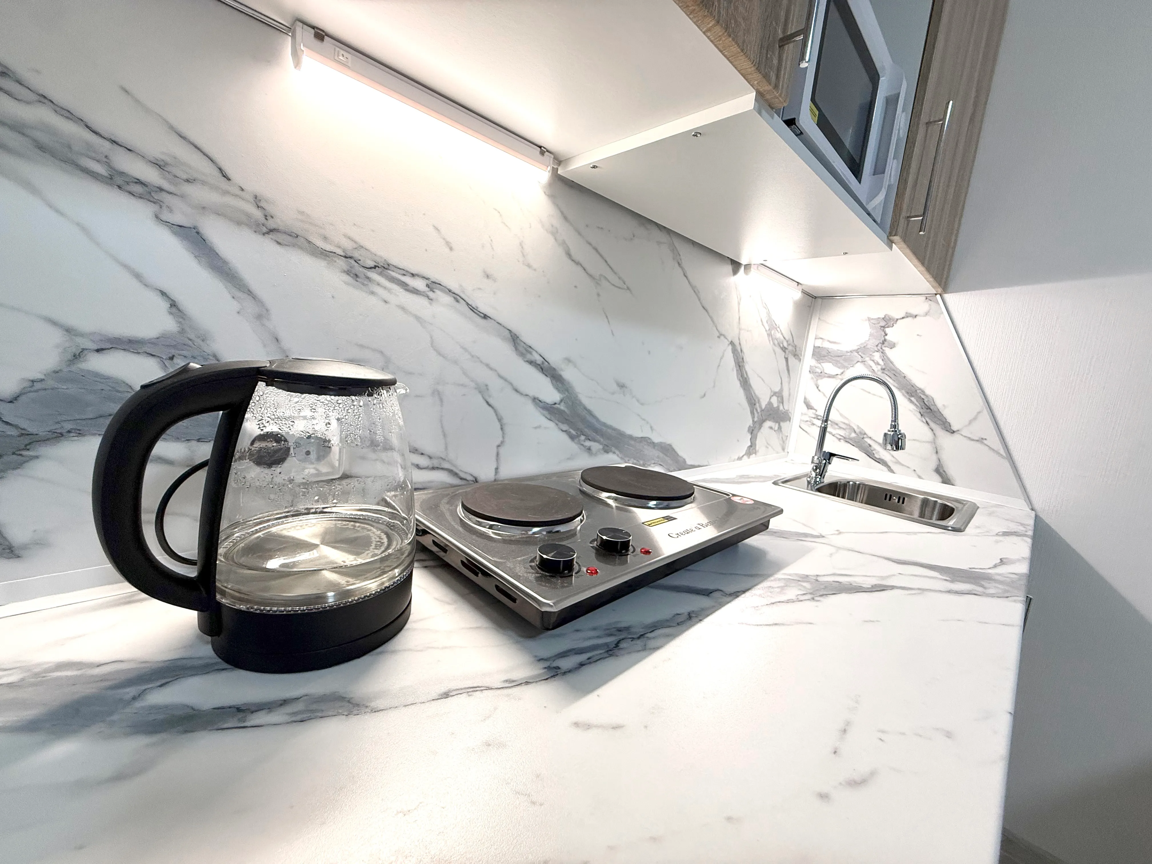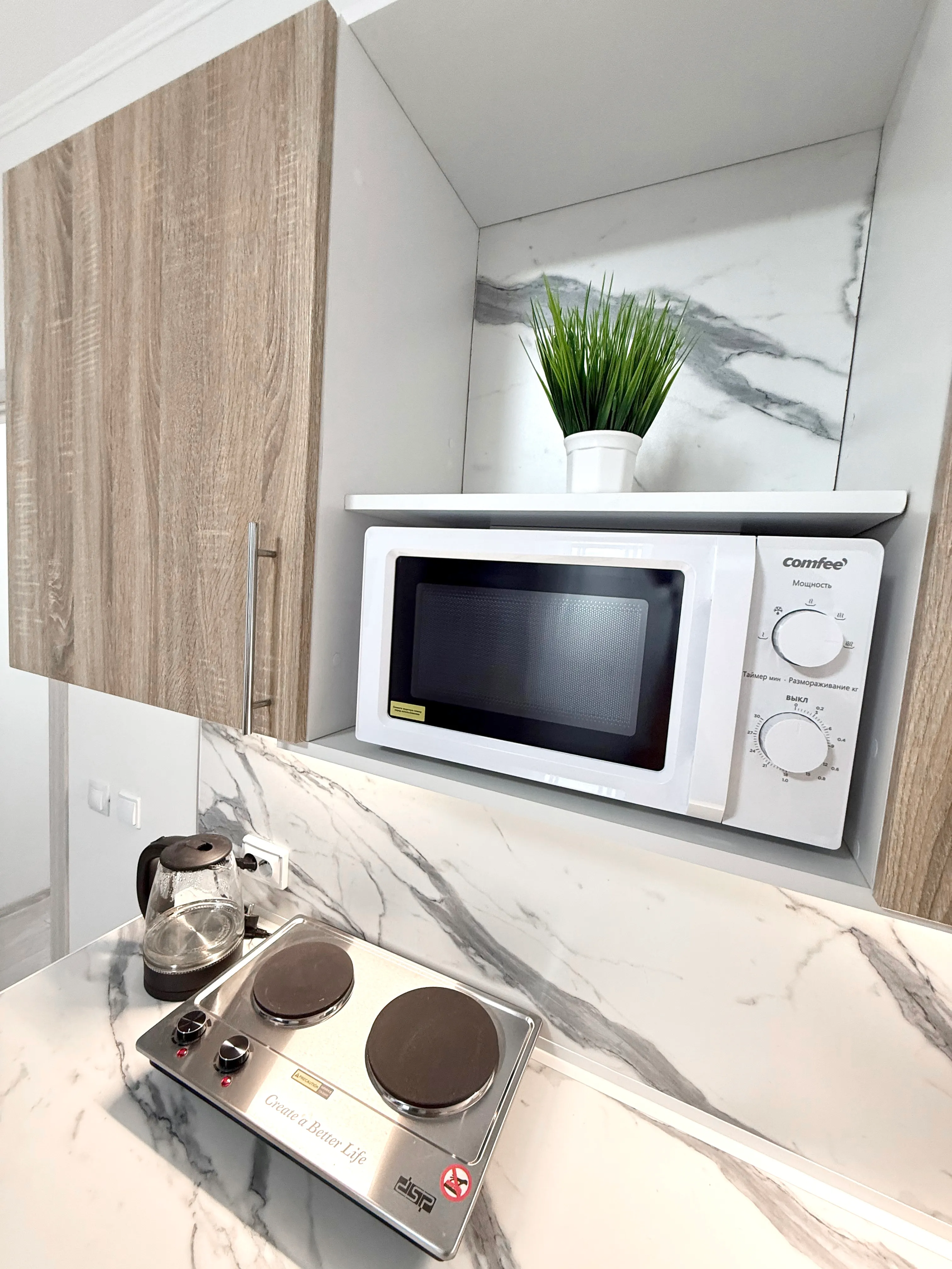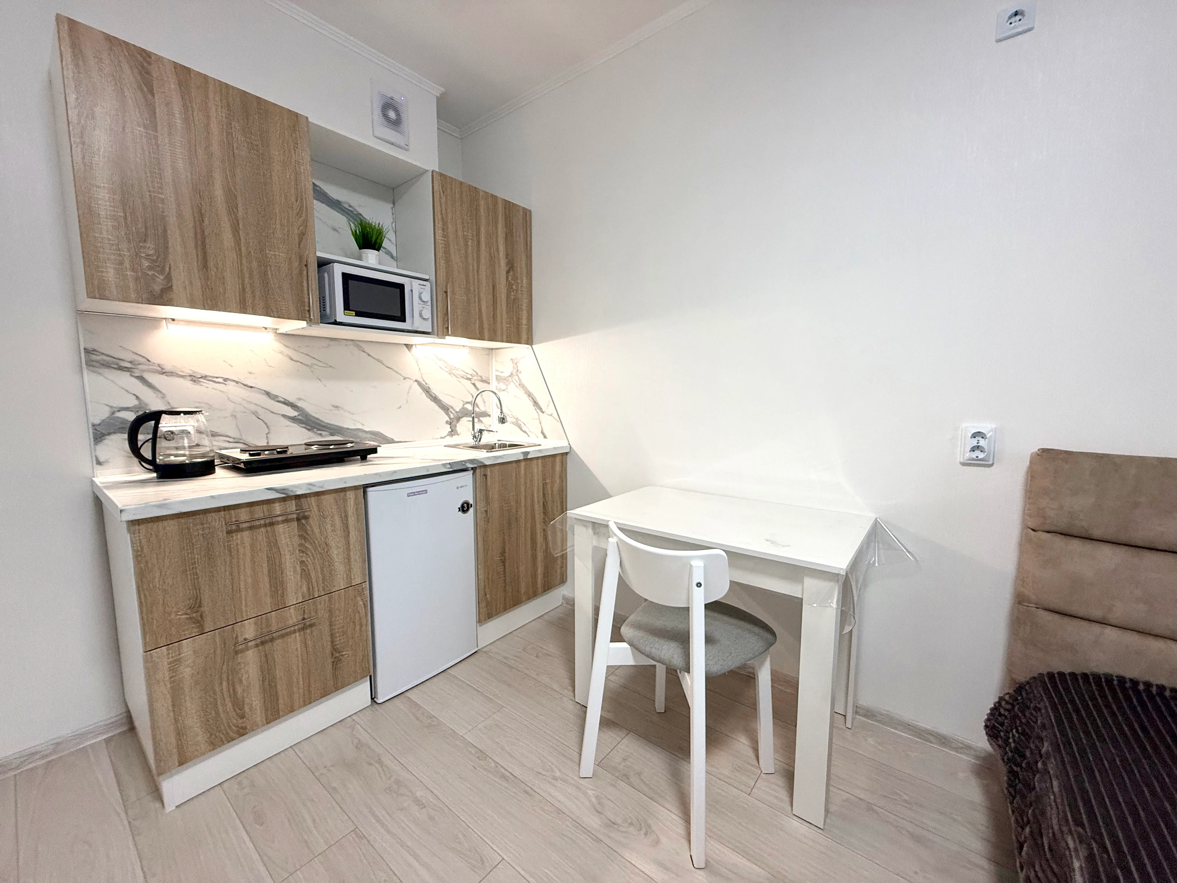 Кухня: электрическая плита, СВЧ печь, холодильник, чайник, фильтр для воды, набор посуды.