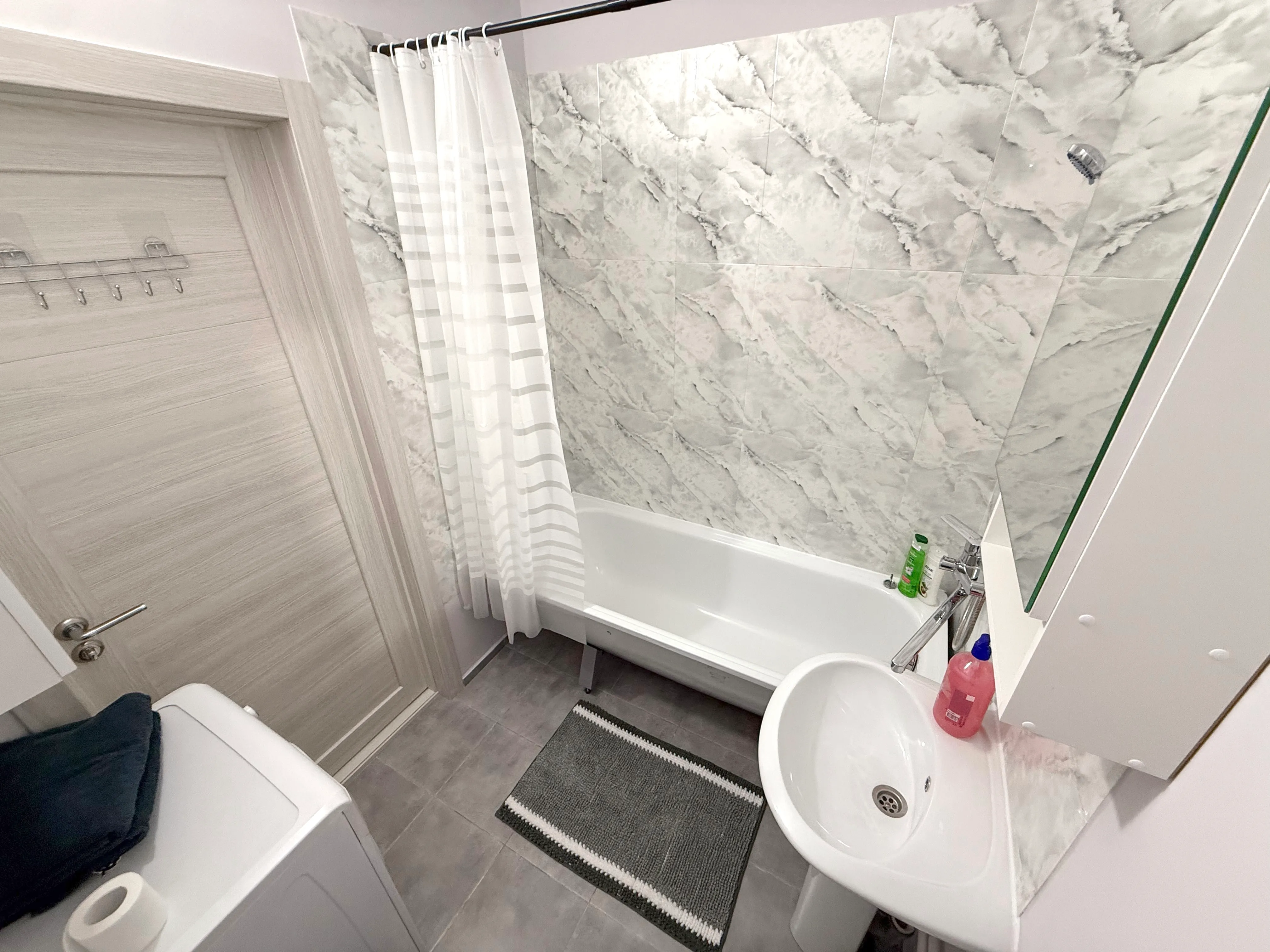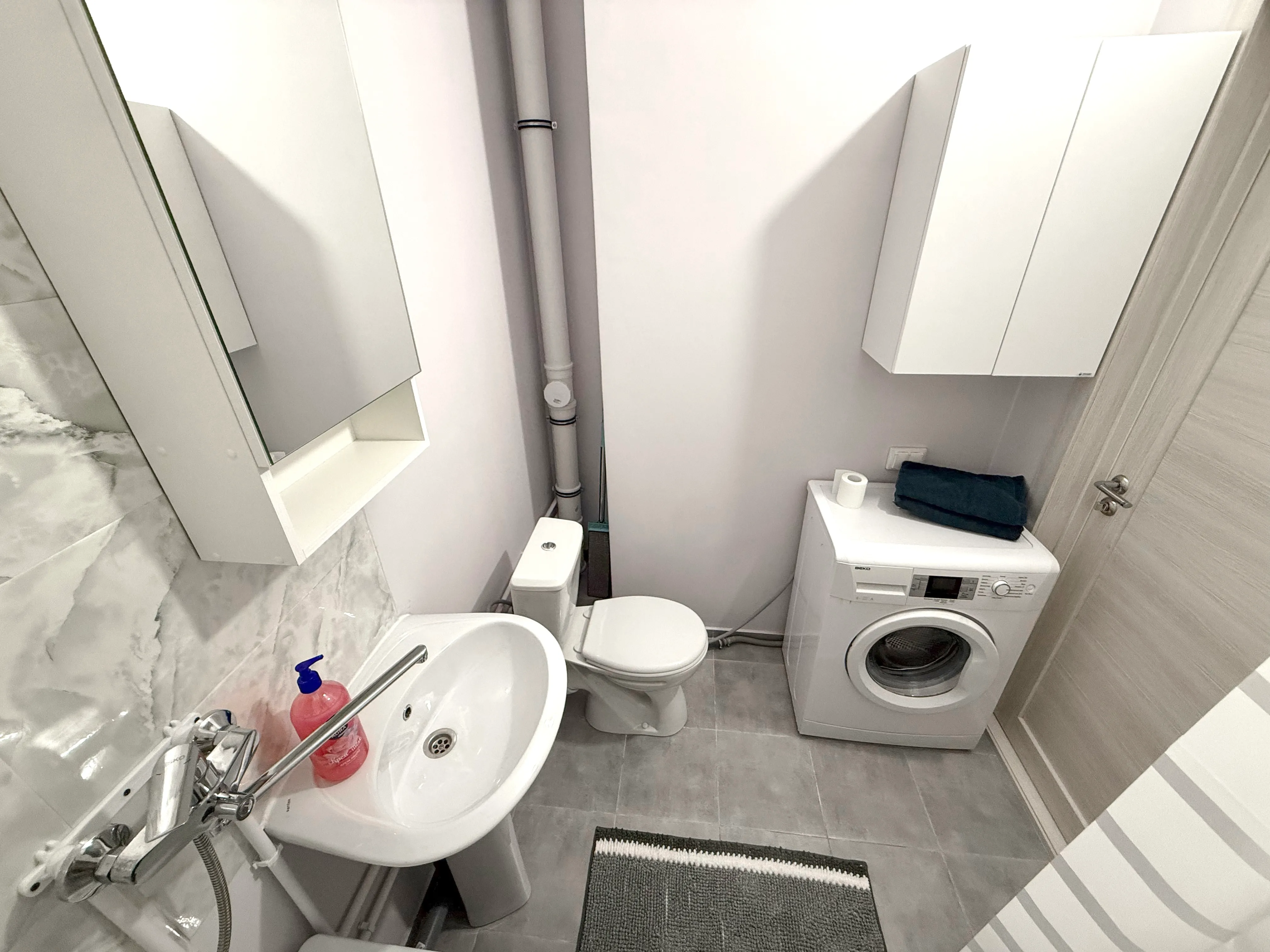 Ванная комната: душевая, стиральная машина, полотенца, утюг, гладильная доска, сушилка, фен, гель для душа, шампунь, мыло, зубная паста.