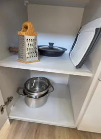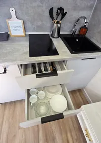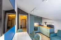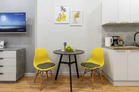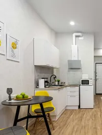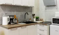 - Кухня: оборудована всей необходимой техникой — холодильником, плитой, микроволновой печью, электрочайником, посудомойкой и набором посуды. Вы сможете приготовить себе любимые блюда или быстро разогреть еду, не выходя из дома.