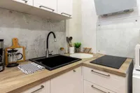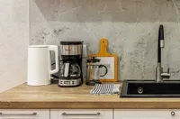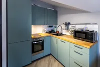 - Современная кухня с необходимой бытовой техникой (холодильник, плита, микроволновая печь, чайник).