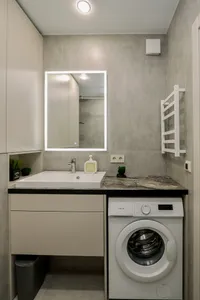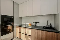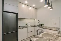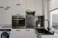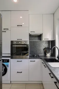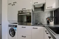 На кухне: кухонный гарнитур, микроволновая печь, электрический чайник, электроплита, стиральная машина, холодильник.