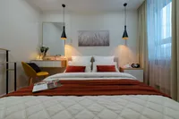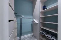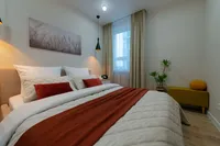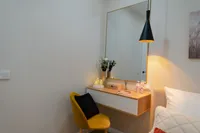 - В оформлении спальни преобладает светлая зеленая цветовая гамма, что подчеркивает ощущение свежести и увеличенного простора. Отличная двуспальная кровать размера king size с ортопедическим матрасом обеспечит качественный сон, а плотные портьеры - полную светоизоляцию. Во вместительном шкафу удобно разместить личные вещи. Для полноценного отдыха спальня оснащена вторым ЖК-телевизором. Также, оборудован уютный туалетный уголок для личного ухода.