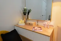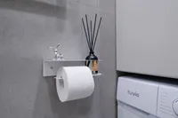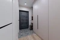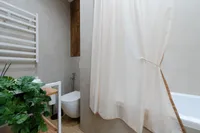 - Светлый санузел оборудован белоснежной сантехникой, сияющей абсолютной чистотой и свежестью. Установлена душевая кабина. Также, гости могут воспользоваться стиральной машиной-автомат и необходимыми принадлежностями для полноценного личного ухода.