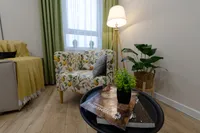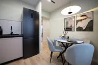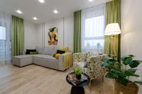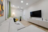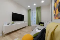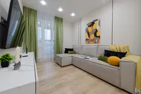 - Современная гостиная гармонично совмещена студией с кухней. Двуспальный диван, при необходимости преображается в удобное спальное место. Большой ЖК - TV с кабельными каналами и высокоскоростной Wi-Fi позволят интересно провести вечер. Также, в гостиной установлен кондиционер, способствующий благоприятному микроклимату.