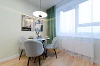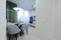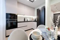 - Великолепная кухня оснащена современным гарнитуром, всей необходимой бытовой техникой, полным комплектом разнообразной посуды на четыре персоны. Для большего удобства установлена посудомоечная машина, что является безусловным преимуществом квартиры.