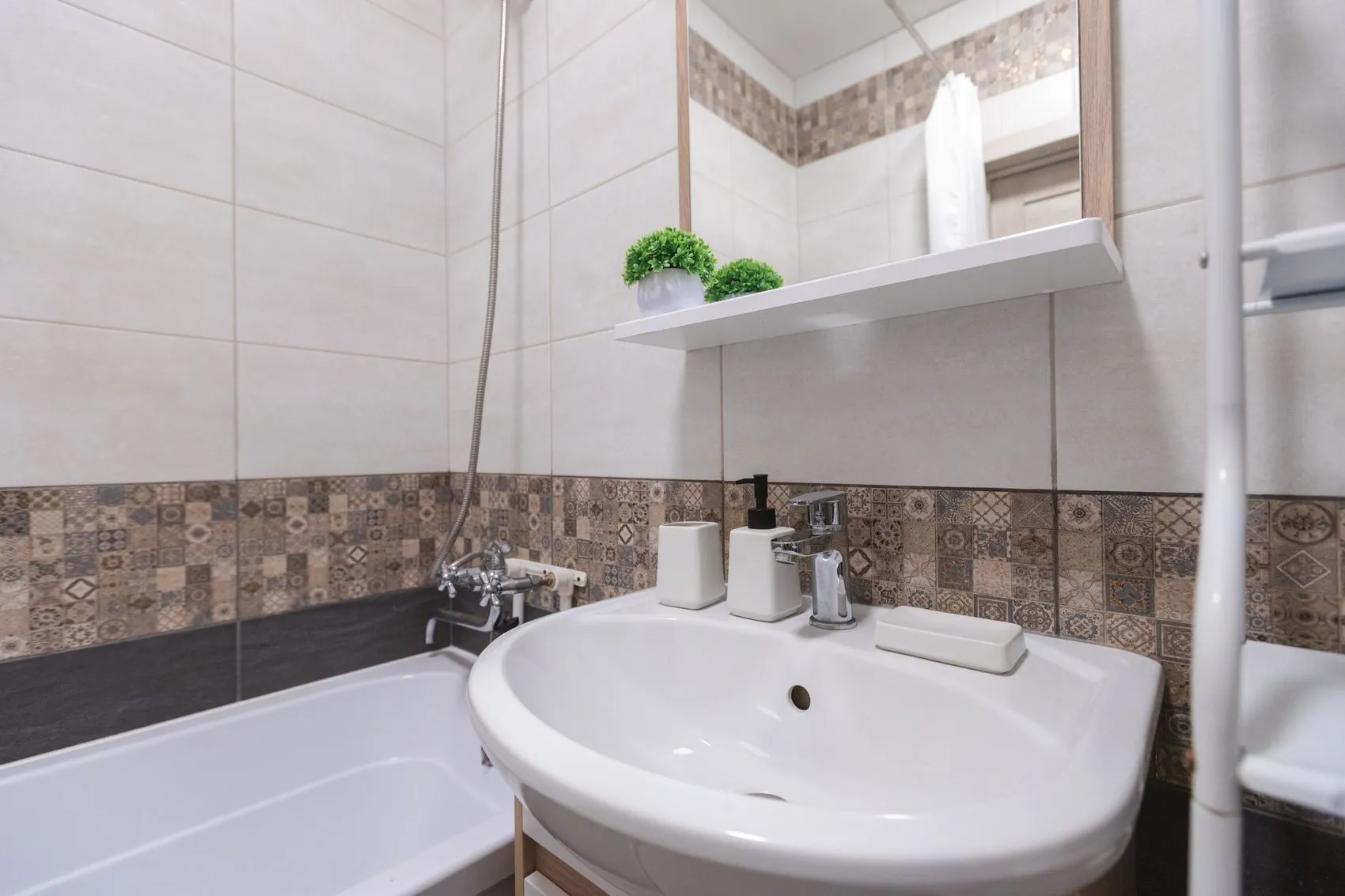 ✅ Совмещённый санузел порадует Вас большой ванной с тропическим душем и стильной раковиной. Имеется фен, утюг и гладильная доска