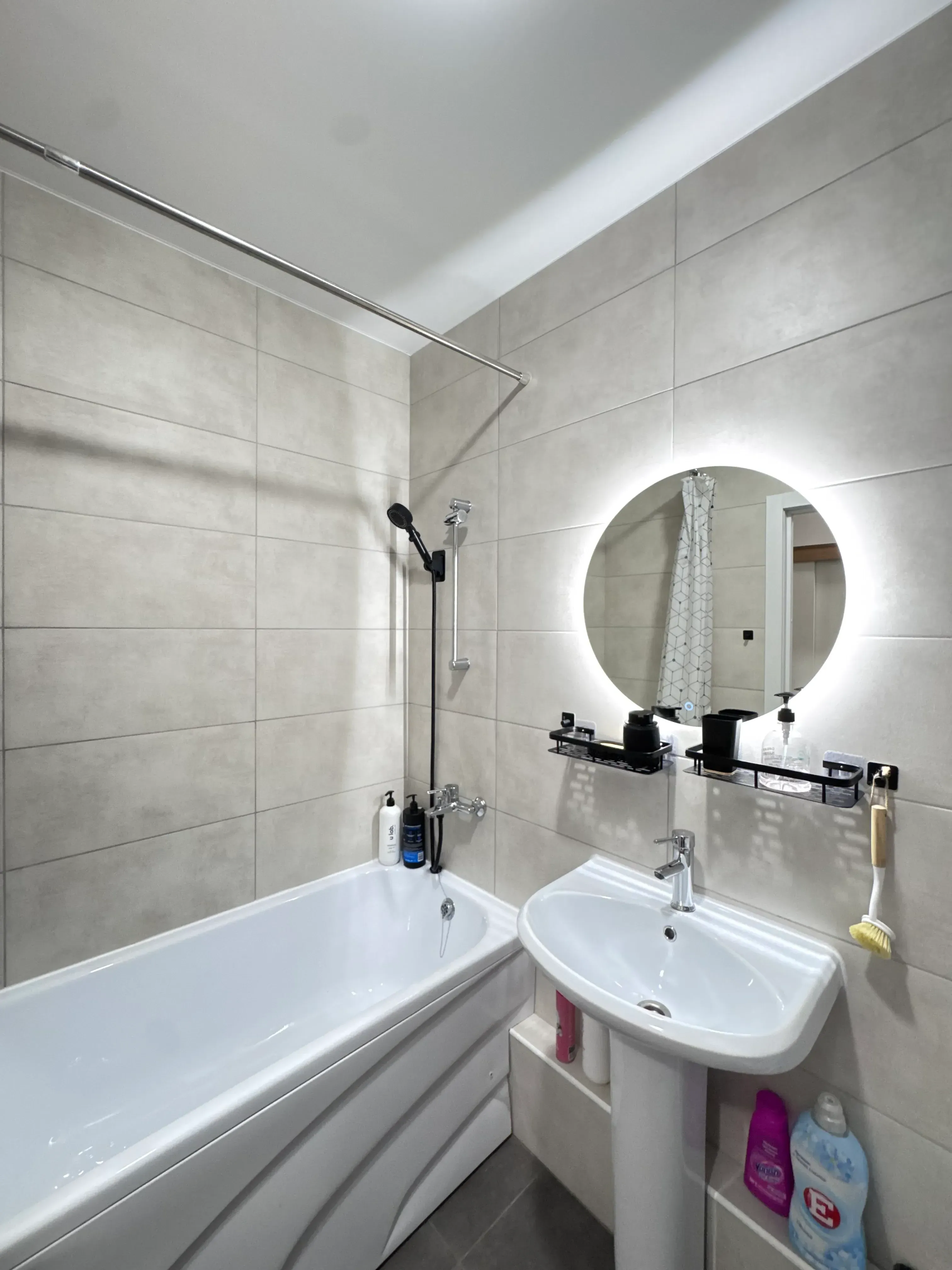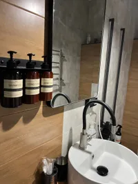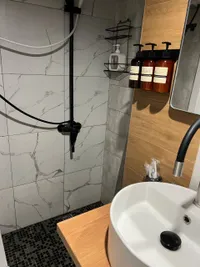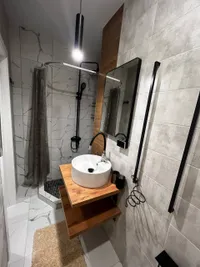 В ванной комнате стиральная машина (и капсулы для неё), нежные и мягкие полотенца, шампунь, гель для душа, мыло, фен. В санузле имеется душевая кабина, а пол уложен керамо - гранитными плитами с регулируемым электроподогревом.