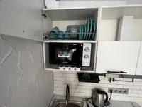 Кухня с посудой, плитой, холодильником, СВЧ-печью и электрическим чайником