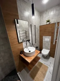 Ванная комната с чистой и исправной современной сантехникой, горячая и холодная вода.