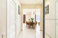 Спальных мест 2+2+2. Санузел совмещённый. Квартира просторная и светлая, тихая и теплая, живя в ней вы будете чувствовать себя уютно, как дома. На кухне есть фильтр для питьевой воды. Не надо тратить силы и деньги на покупку бутилированной. Есть вся необходимая новая и красивая посуда, кухонная утварь, блендер, установлена индукционная плита и духовка для приготовления своей любимой и привычной еды. Телевизоры в комнатах и кухне-гостиной. Подключено многоканальное телевидение (каналы со всего мира). Есть детский стол и стулья, стульчик для кормления.