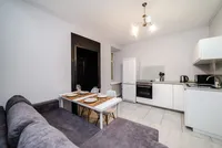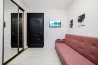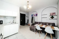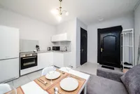 - Светлая кухня-гостиная, где вы найдете диван, необходимую технику и необходимую посуду для приготовления пищи.