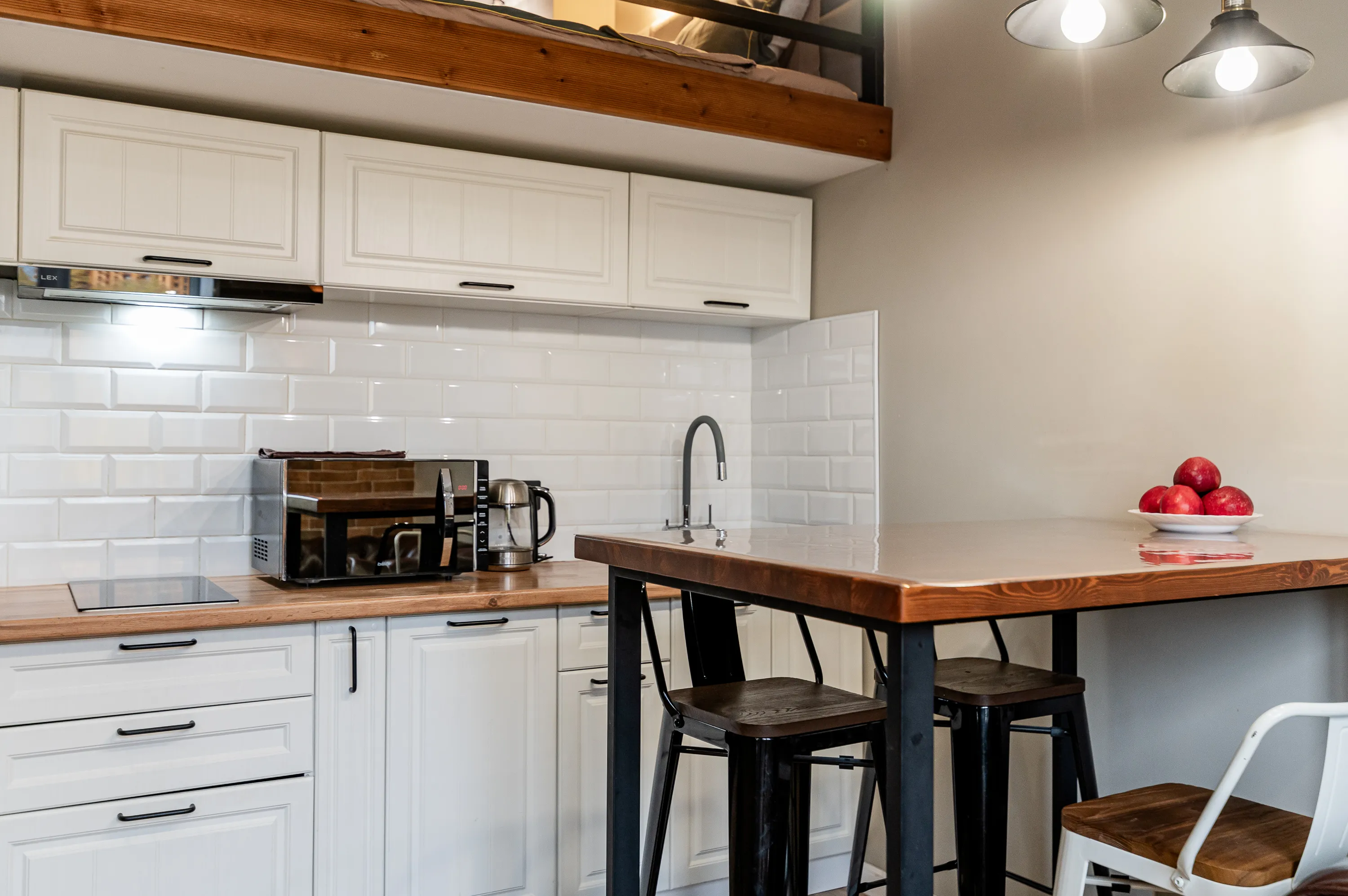 4. Полный комплект посуды на троих, столовые приборы и всё необходимое для приготовления домашних завтраков, обедов, ужинов;