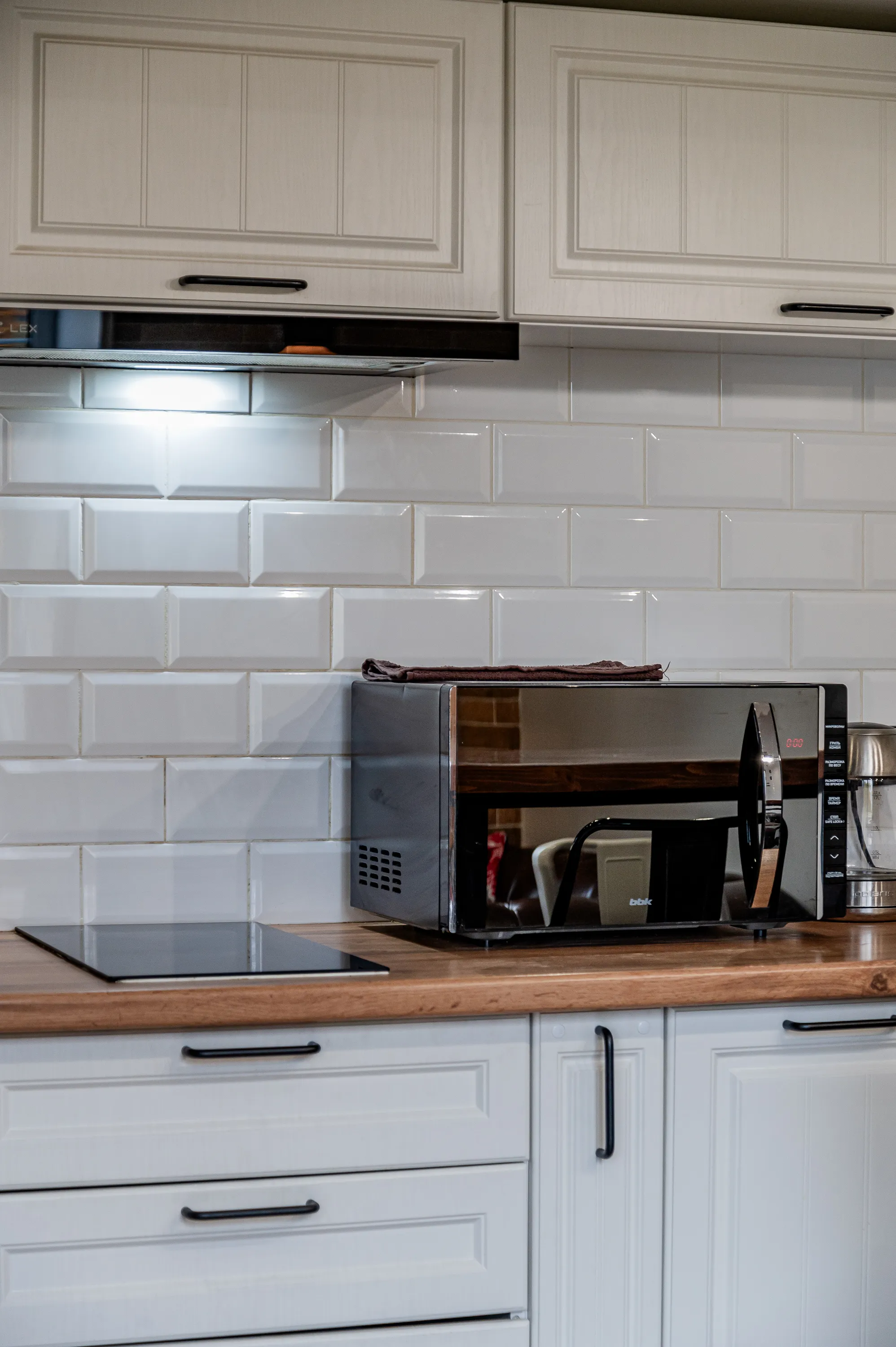 - Современная кухня, чайник, микроволновка, холодильник, посуда,