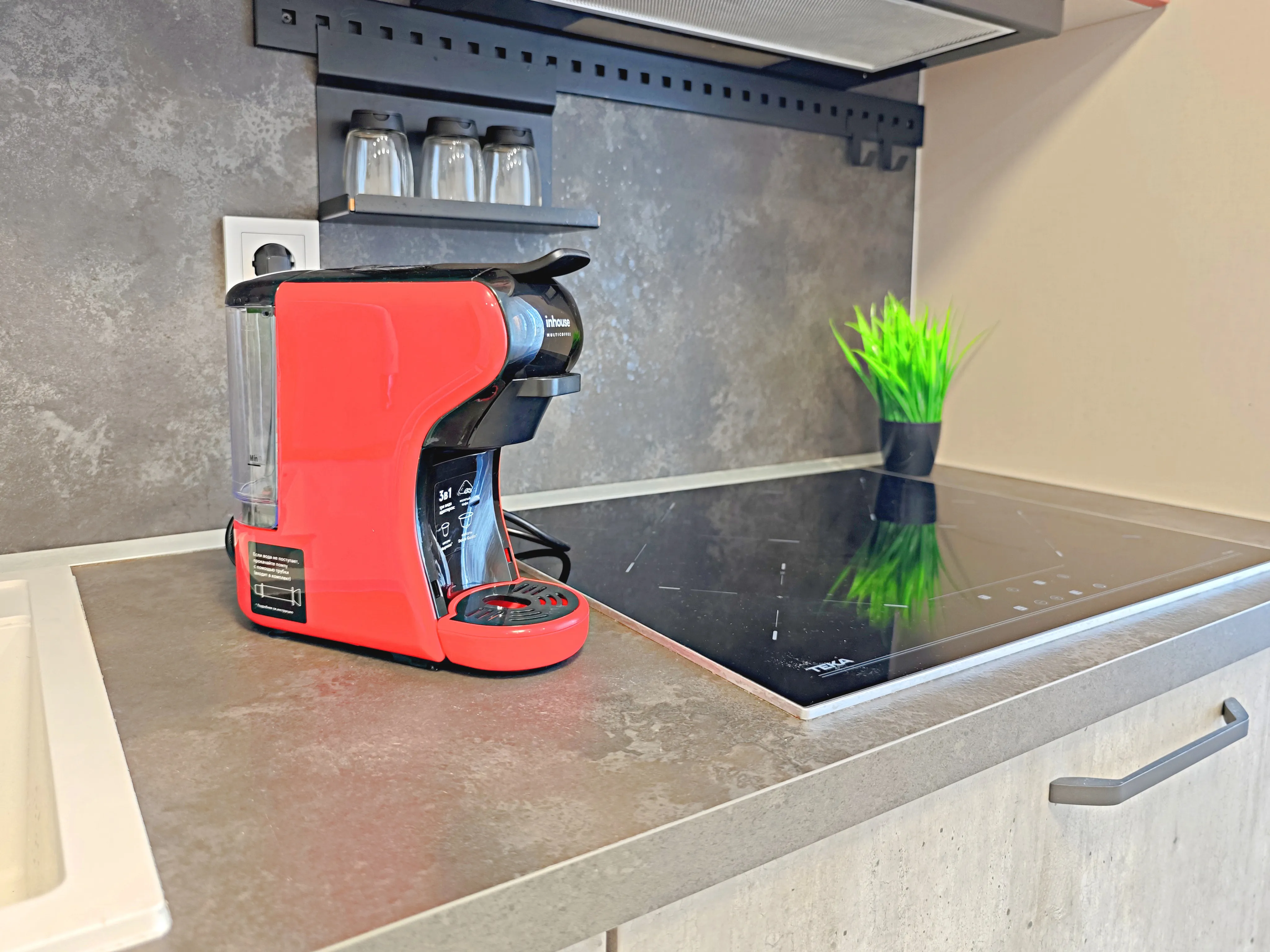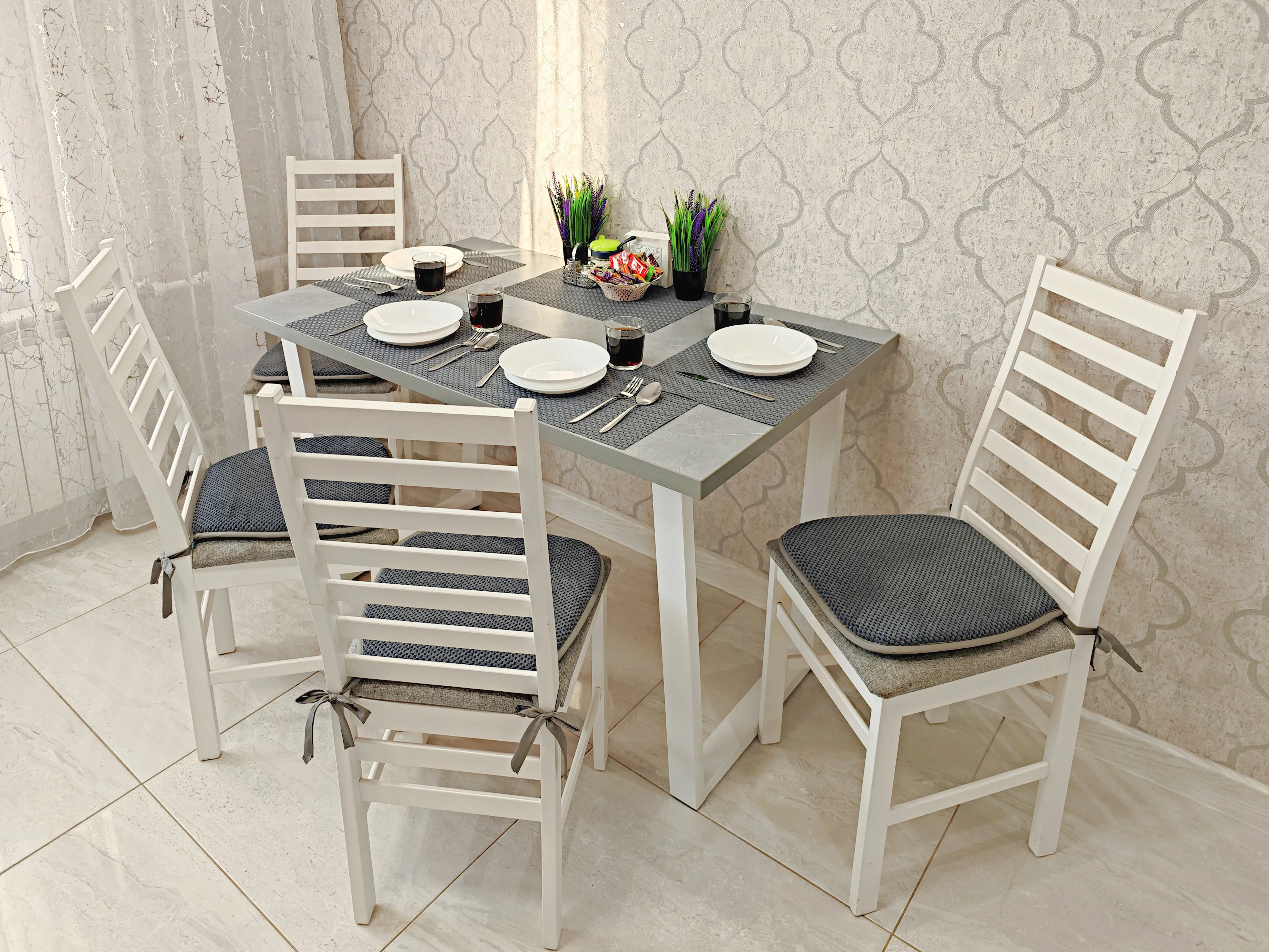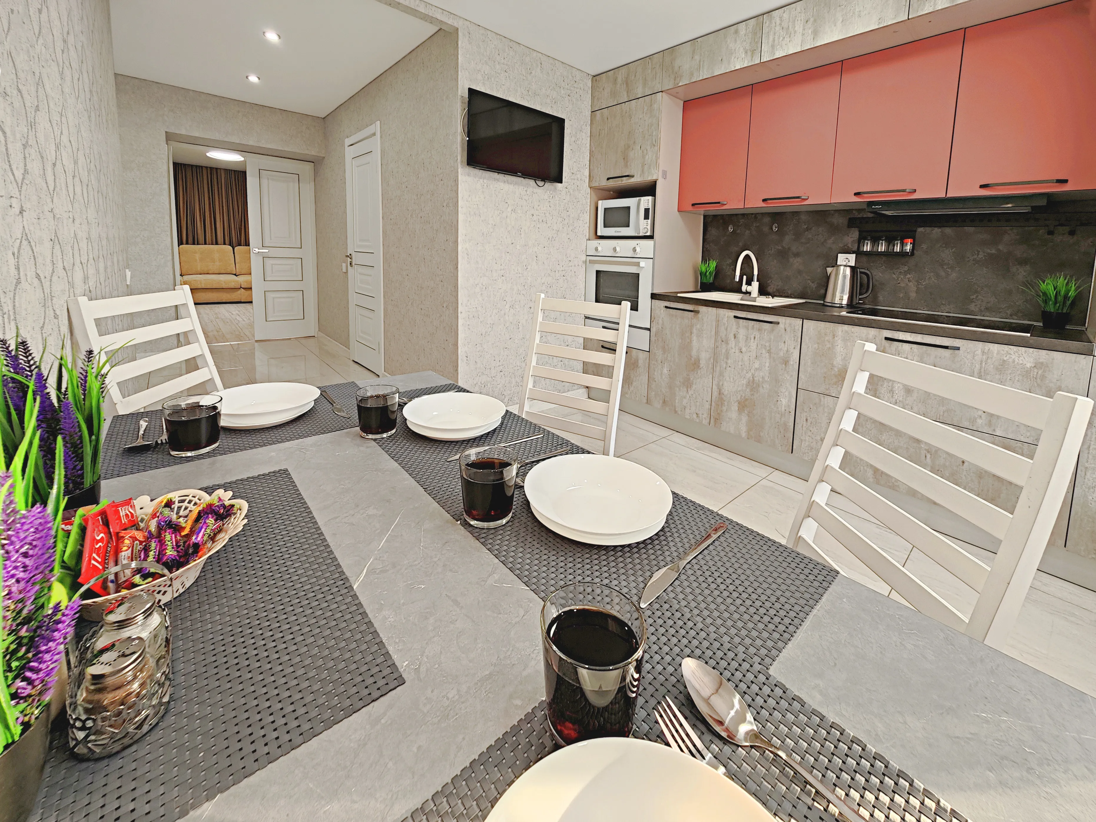 Дорогие гости, в квартире вас ожидает набор продуктов первой необходимости – сладости, пакетированный чай, кофе, сахар, соль, перец в одноразовых стиках.