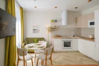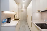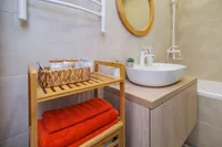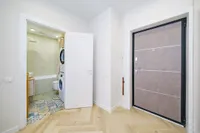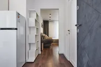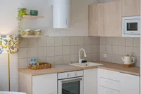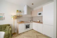 Полностью оборудованная кухня со всей необходимой техникой, в т.ч. духовой шкаф, посудомоечная машина. Ванная комната с душем, стиральная машина. Индивидуальное газовое отопление. Вид на город. Без балкона. Большая зеленая закрытая территория дома, несколько детских площадок, теннисный корт, площадка для футбола. Бесплатная парковка рядом с домом.