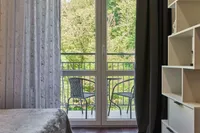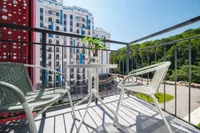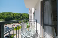 Имеется большой балкон со стеклянной опорой,где будет приятно пить кофе по утрам,глядя на море и вечером,сидя с бокалом вина наслаждаться видами на вечерний Сочи.