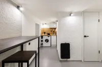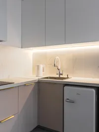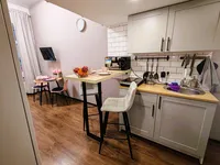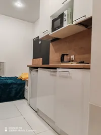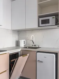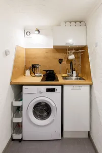 - Кухонная зона: холодильник, микроволновая печь, чайник, варочная панель, посуда и столовые приборы (имеются бокалы для вина), стиральная машина и стиральный порошок