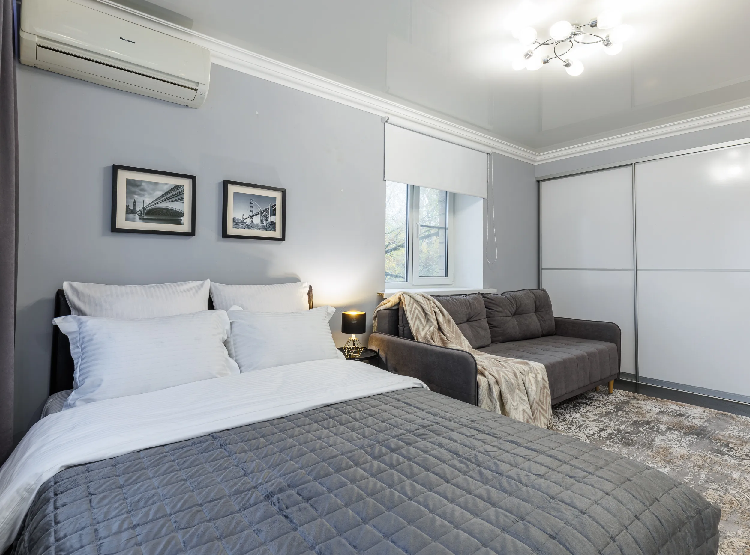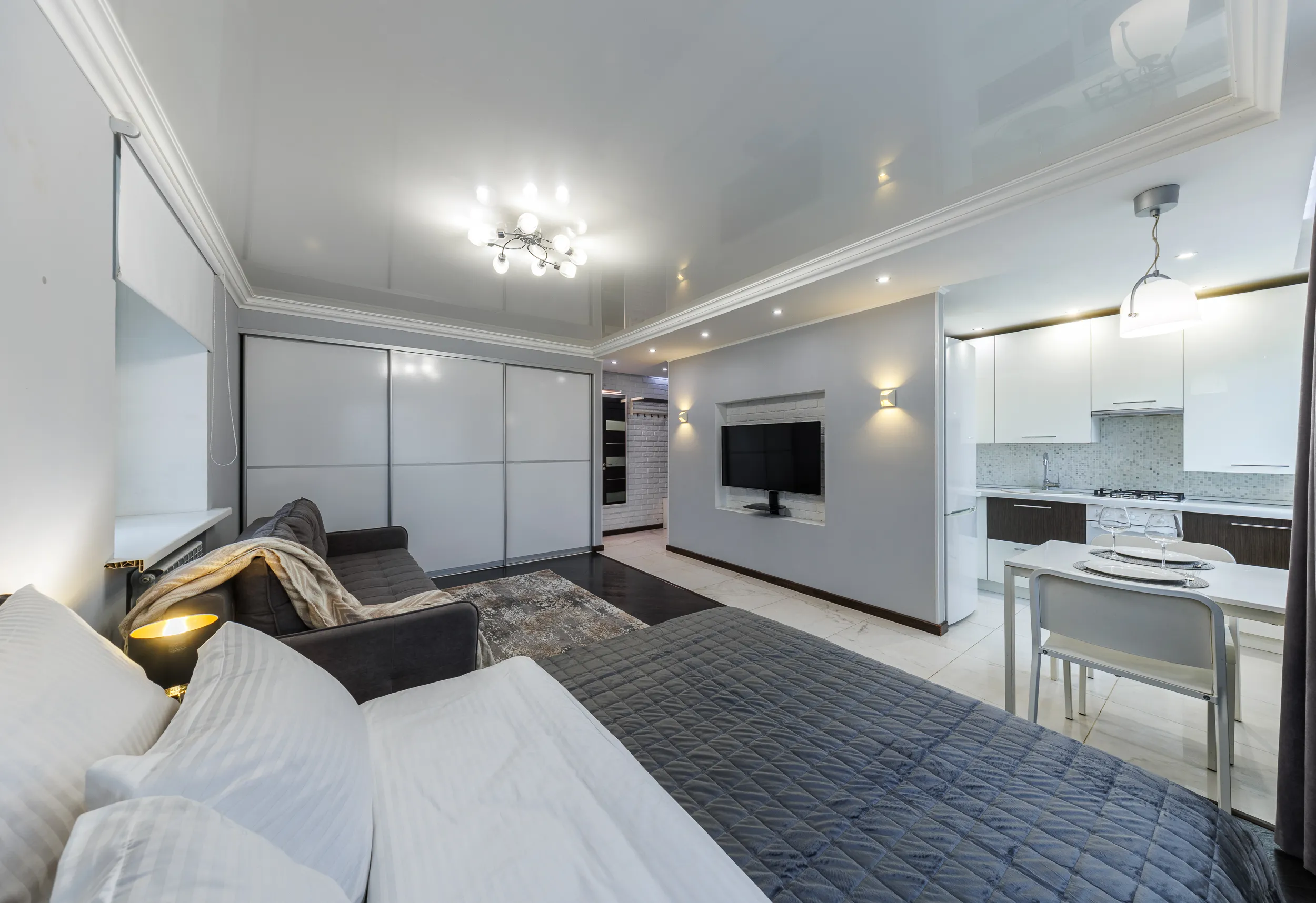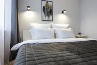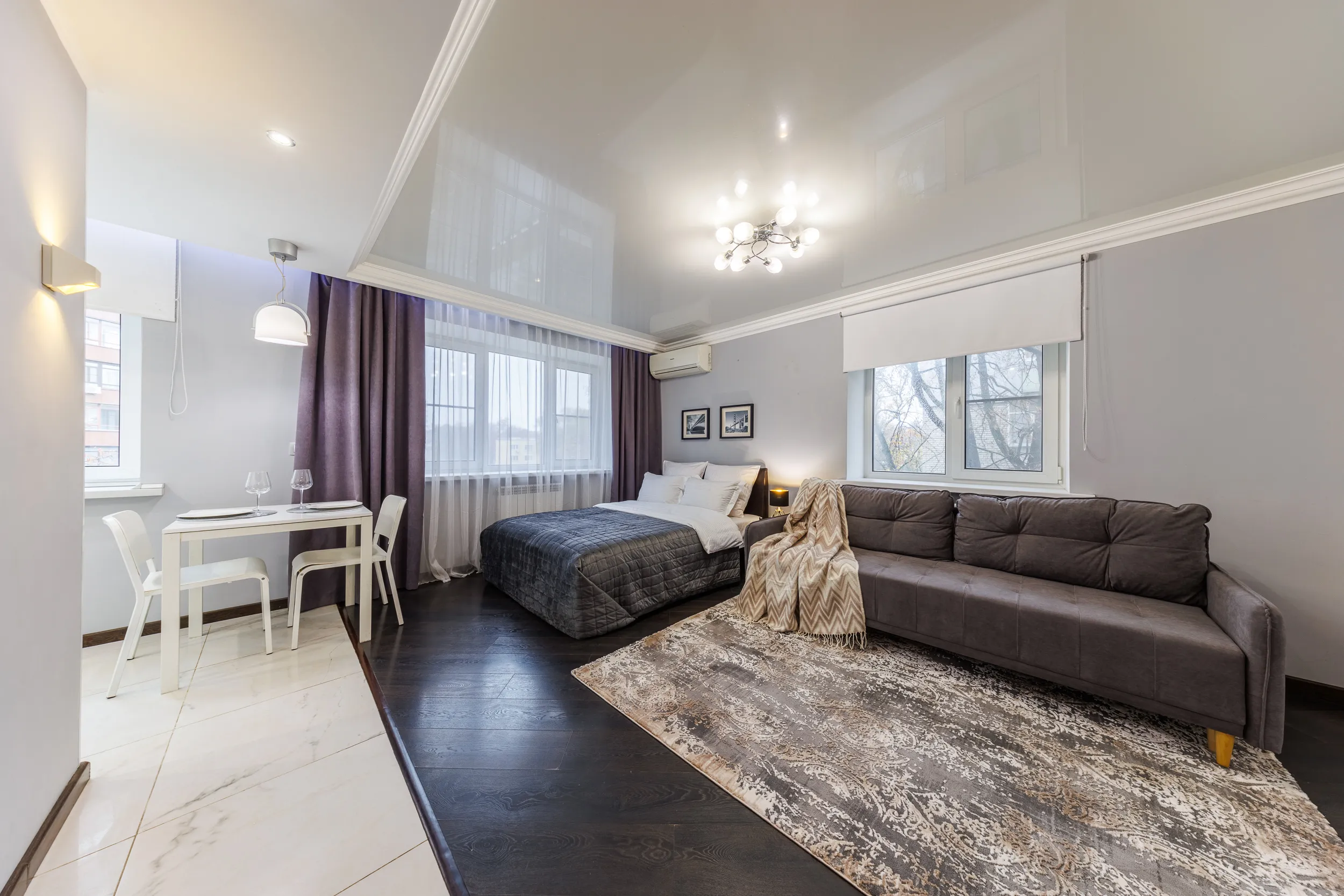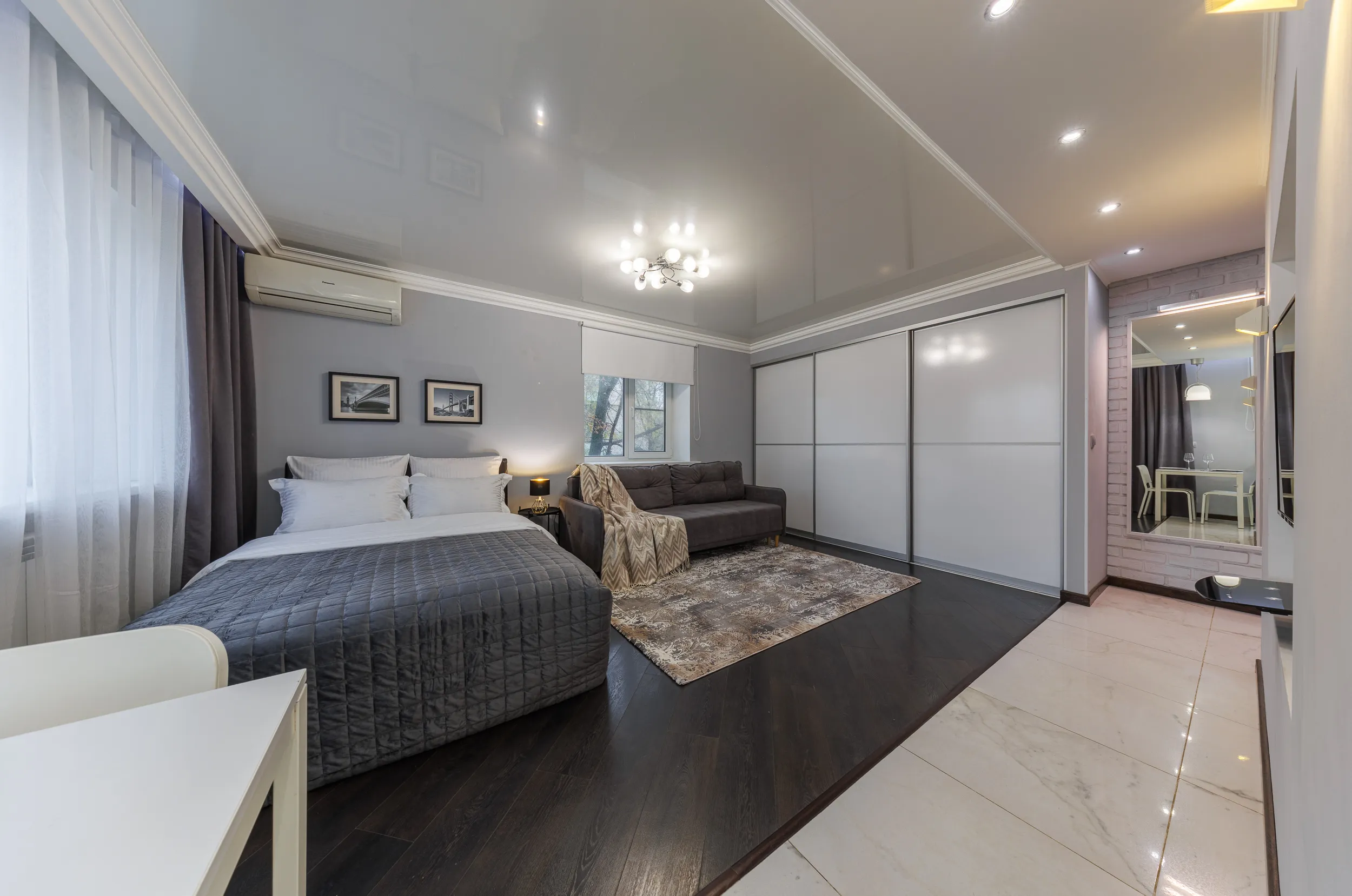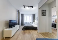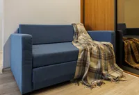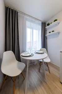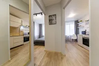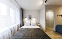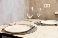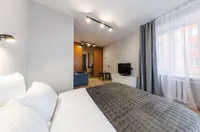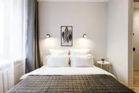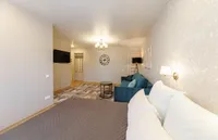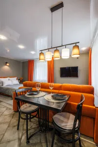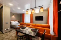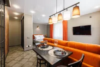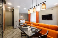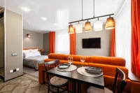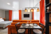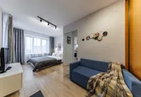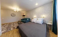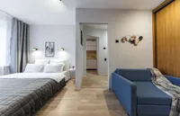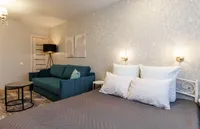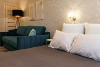 Двуспальная кровать с ортопедическим матрасом и удобный раскладной диван. Полноценная кухня с обеденной зоной. Необходимая бытовая техника и набор одноразовых ванных принадлежностей.