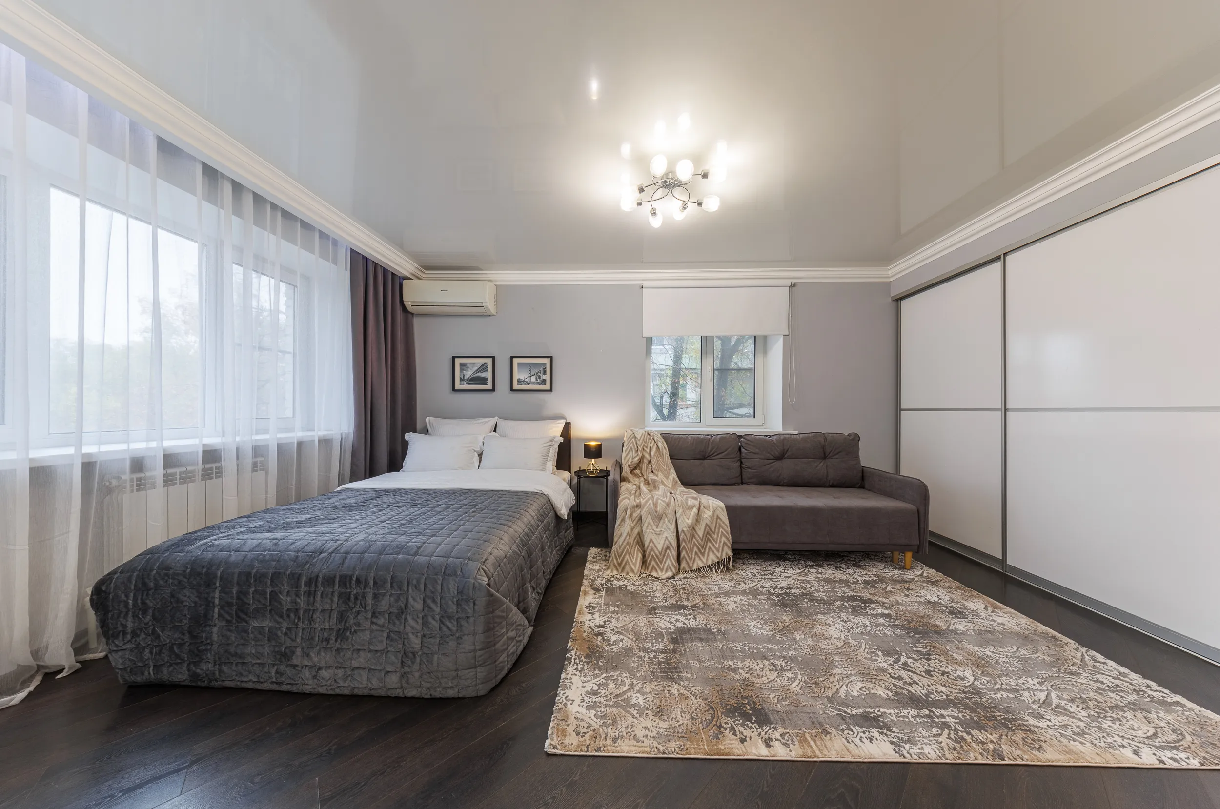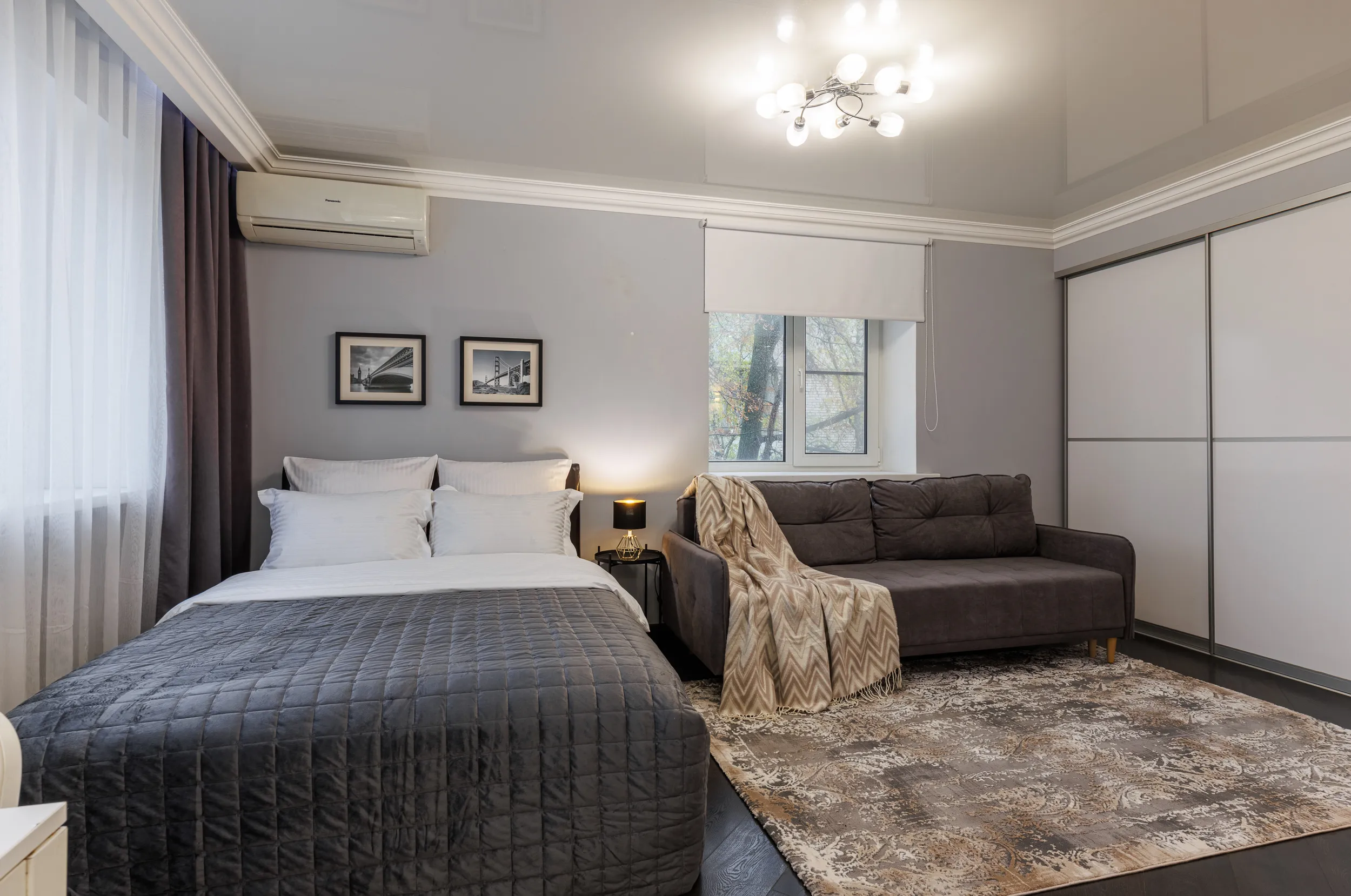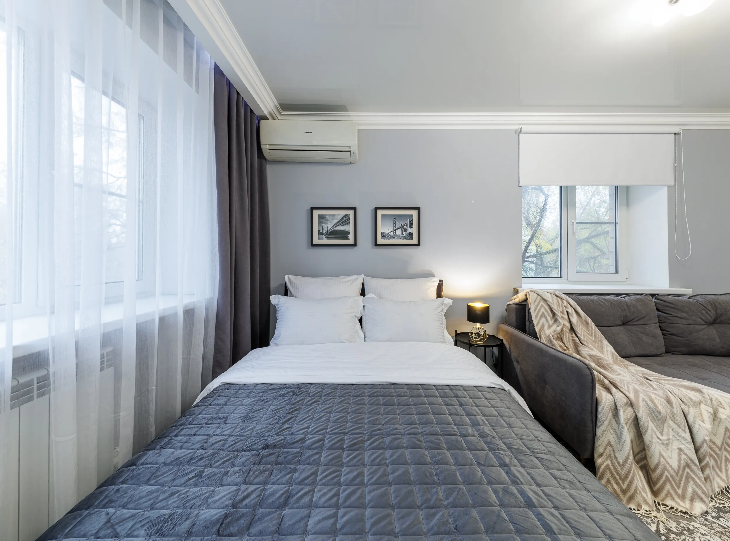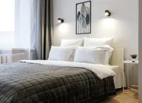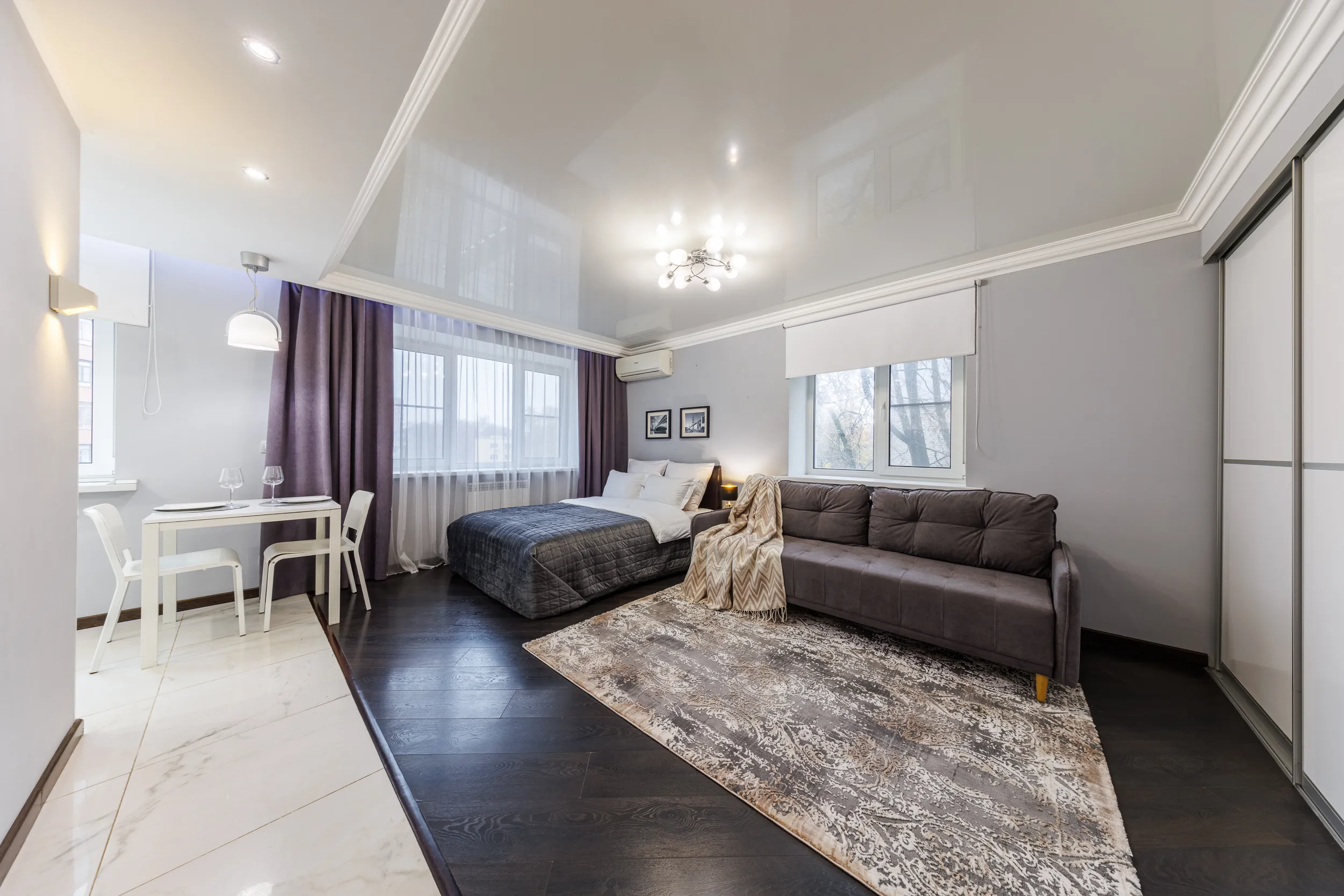 Двуспальная кровать с ортопедическим матрасом и удобный раскладной диван. Полноценная кухня с обеденной зоной. Необходимая бытовая техника и набор одноразовых ванных принадлежностей.