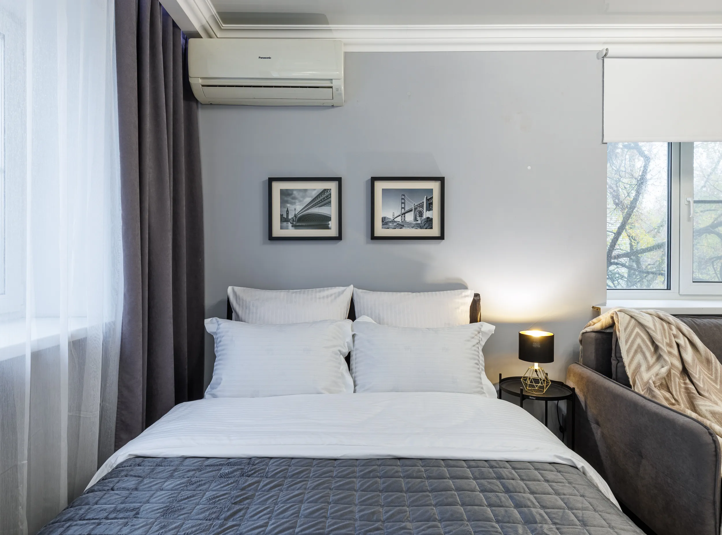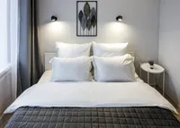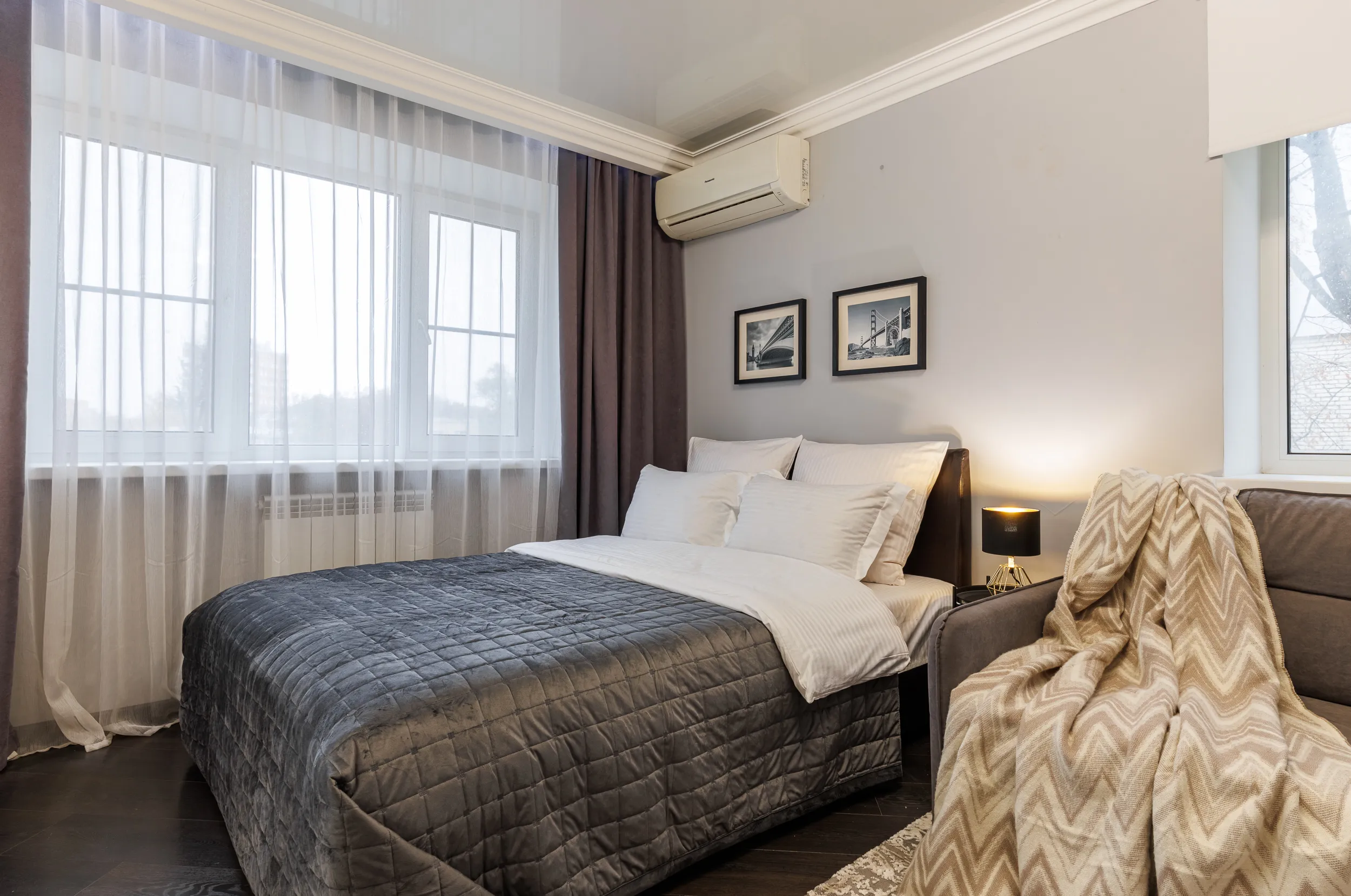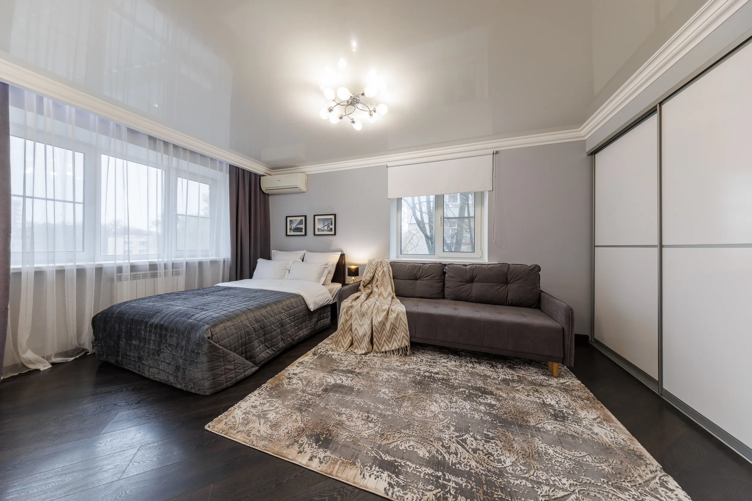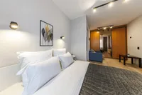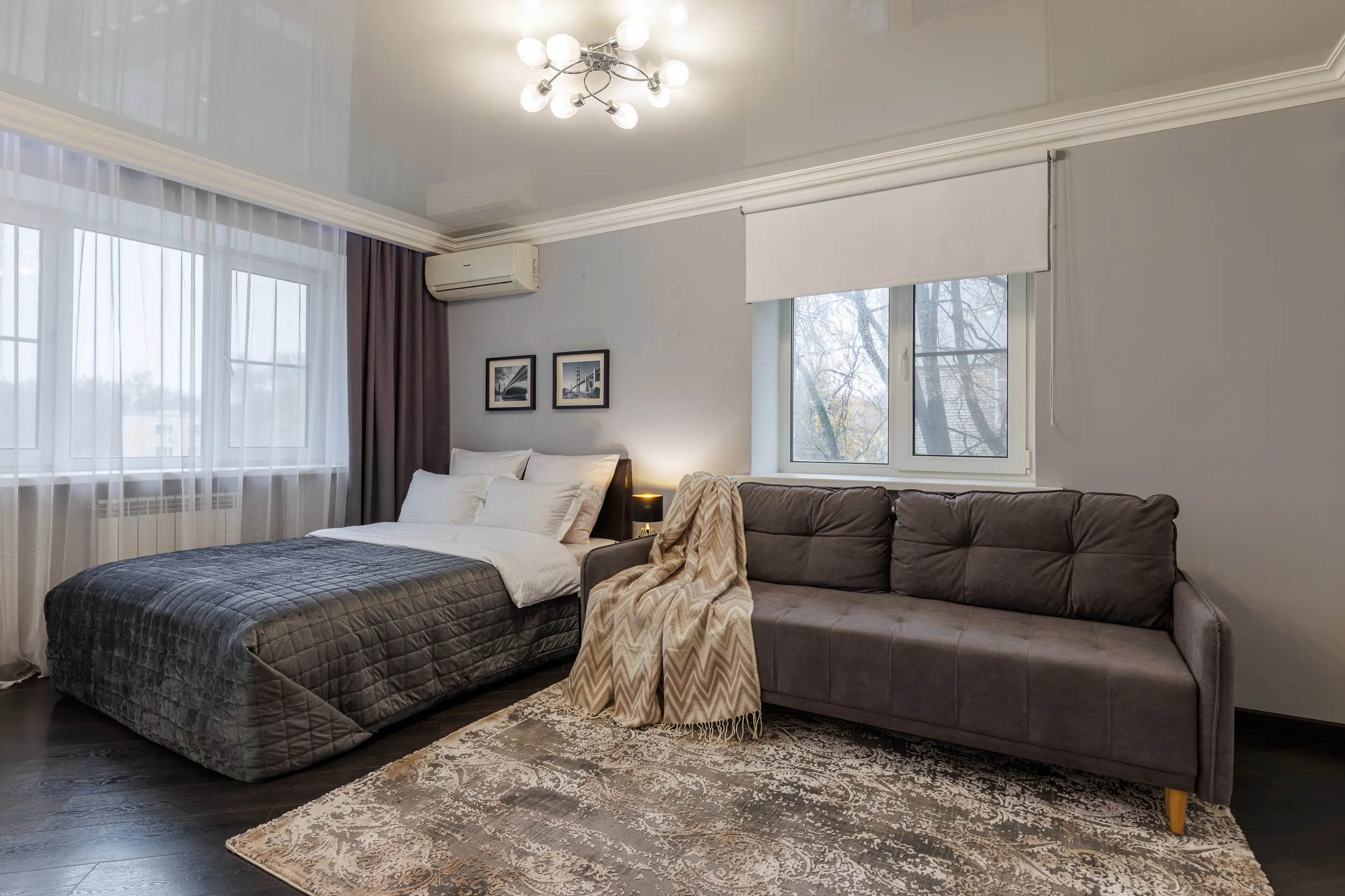 Двуспальная кровать с ортопедическим матрасом и удобный раскладной диван. Полноценная кухня с обеденной зоной. Необходимая бытовая техника и набор одноразовых ванных принадлежностей.