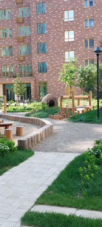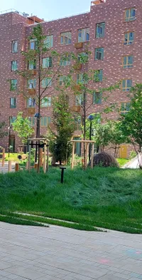 ✅ Огромная зелёная территория – дорожки, клумбы, деревья, детские площадки. Почти свой собственный парк не выходя за пределы ЖК.