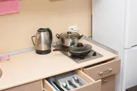 - На кухне имеется вся необходимая посуда для приготовления и принятия пищи; СВЧ-печь, эл.плита с духовкой, холодильник, электрочайник.