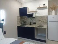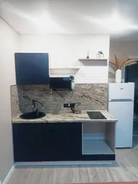 - кухня со всем необходимым для проживания (индукционная поверхность, холодильник, микроволновая печь, духовка, чайник),